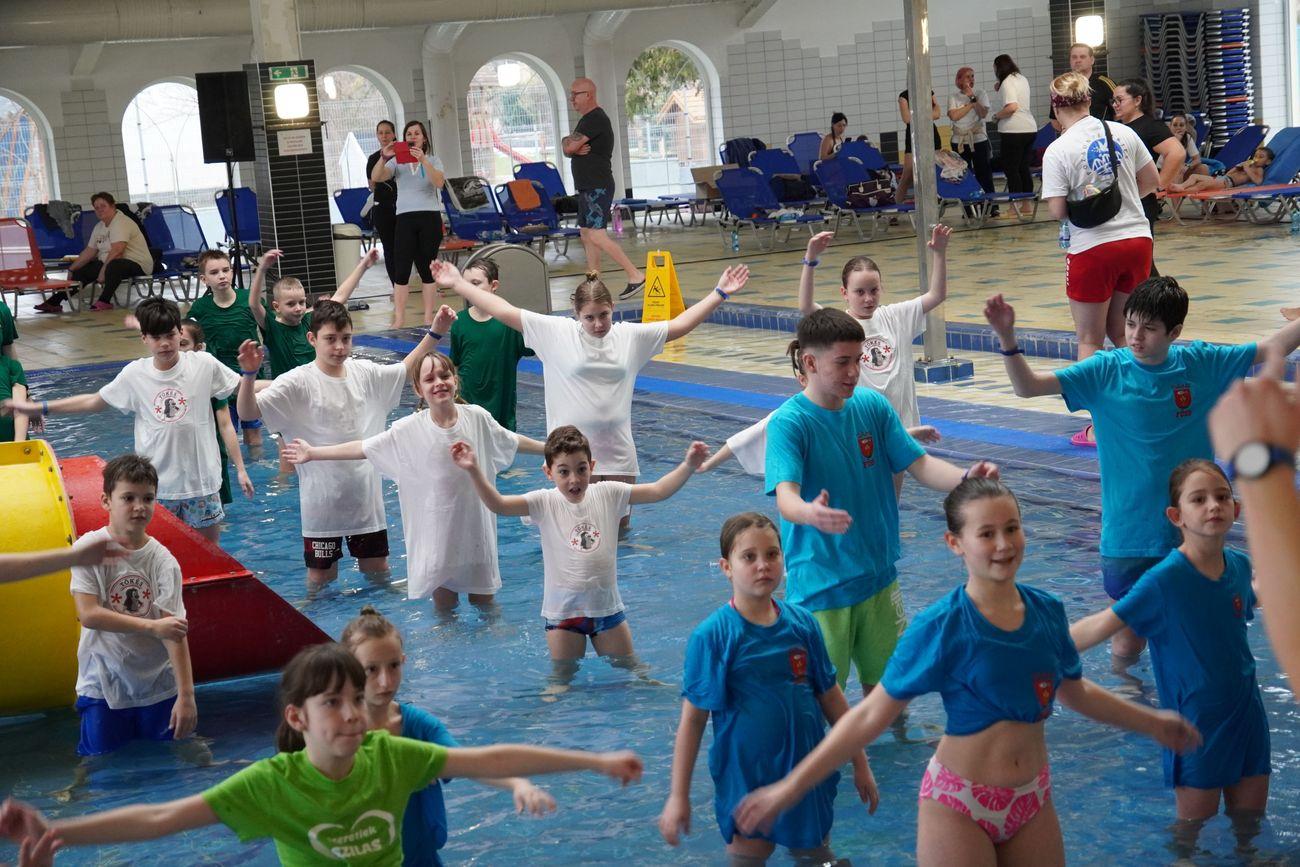 Az első szám lufihordás volt fejjel, kerékbe. Nehézségét egyértelműen a vízben való óvatos, de gyors oldalazás, illetve a kobakok közé szorított (nem túlságosan, hiszen akkor durran!), a vízcseppektől kifejezetten síkos lufi célba juttatása volt. A második megmérettetés talán nem is elsősorban a csapatok játékosainak volt húzós, hanem pedagógusuknak, aki vállalta, hogy megtartja a vonallal jelzett kannát. A feladat ugyanis az volt, hogy merőkanalakkal a lehető legrövidebb idő alatt kellett megtölteni az edényt. Ez természetesen őrült fröcskölésbe torkollott, melynek következményeként a kísérők, mint öntött ürgék hagyták el a versenyteret.