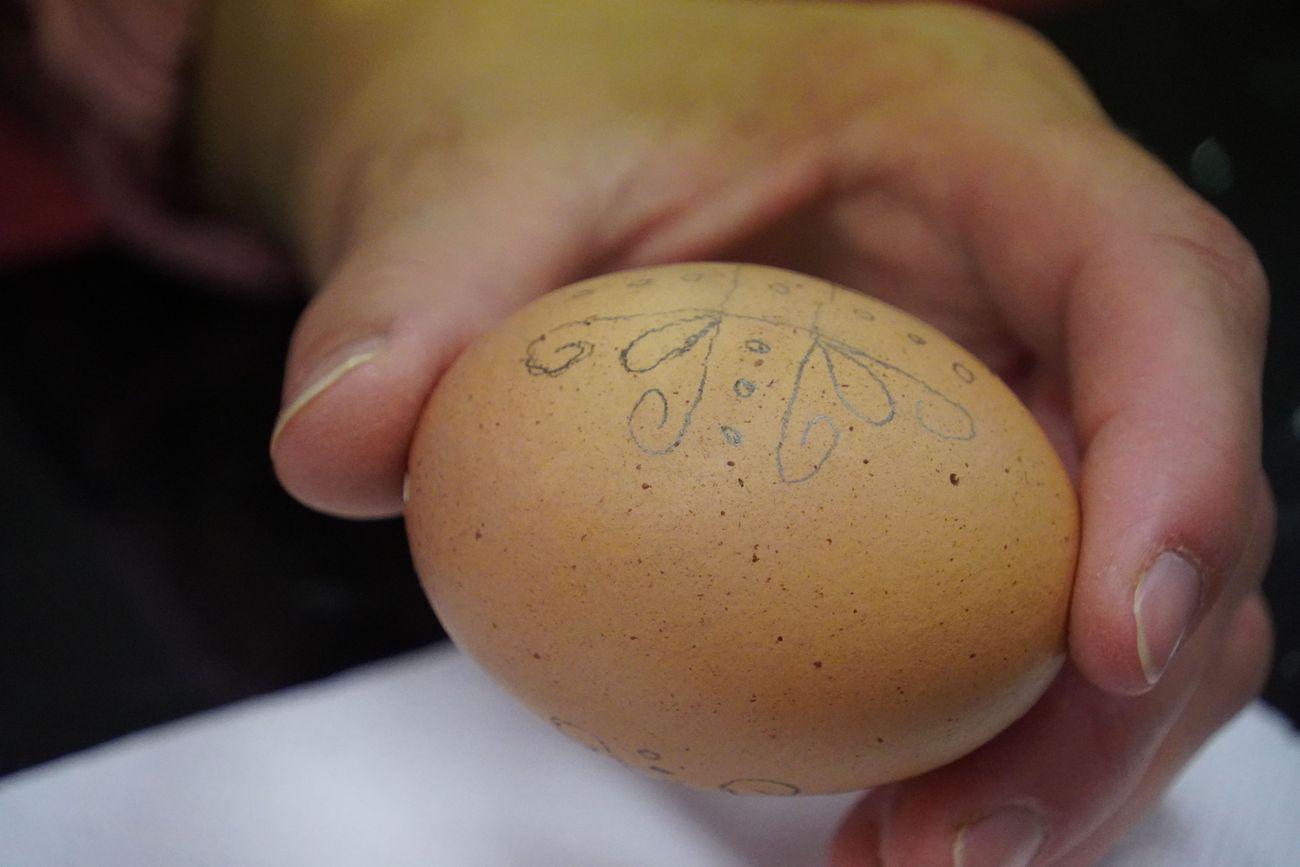 „Foglalkozásunk azzal indult, hogy Farkas Eszter bemutatta, hogyan kell a tojást szakszerűen kilyukasztani, majd annak beltartalmát kifújni. Hozzáteszem, a hagyományos tojásírás hosszan főtt kemény tojást kíván, azonban – mivel bő egy hetünk van még a locsolkodásig, és addig sajnos a beltartalmas tojás nem bírná ki frissen – inkább ezt a módszert választottuk – a kiállításban szereplő hímestojások is fújtak. Ezután fecskendővel vizet spricceltünk a héj belsejébe, átöblögettük, hogy teljesen tisztává varázsoljuk. Levetítettük Benkó Tünde „A Szakkör”-ös kisfilmjét, melyben Fülekkovácsihoz kötődő mintákat mutat be: a múzeumpedagógiai foglalkozáson gyöngyvirágos motívumot tanítottunk, valamint zoboraljai és nógrádi mintákat prezentáltunk. Mindkettőre jellemzőek a növényi motívumok, valamint a szakrális, geometriai és kozmogonikus jelek”