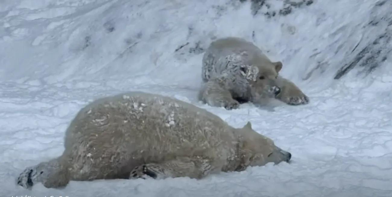 A novemberben egyéves kort betöltött jegesmedvebocsok valódi gyermeki lelkesedéssel vetették bele magukat az új élménybe. Az állatkert által közzétett rövid videófelvétel tanúsága szerint a két nagytestű emlős valósággal extázisba esett a frissen hullott hó láttán.